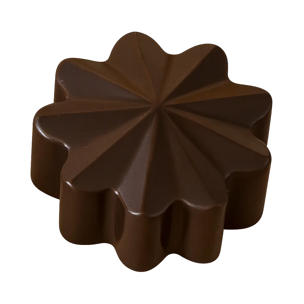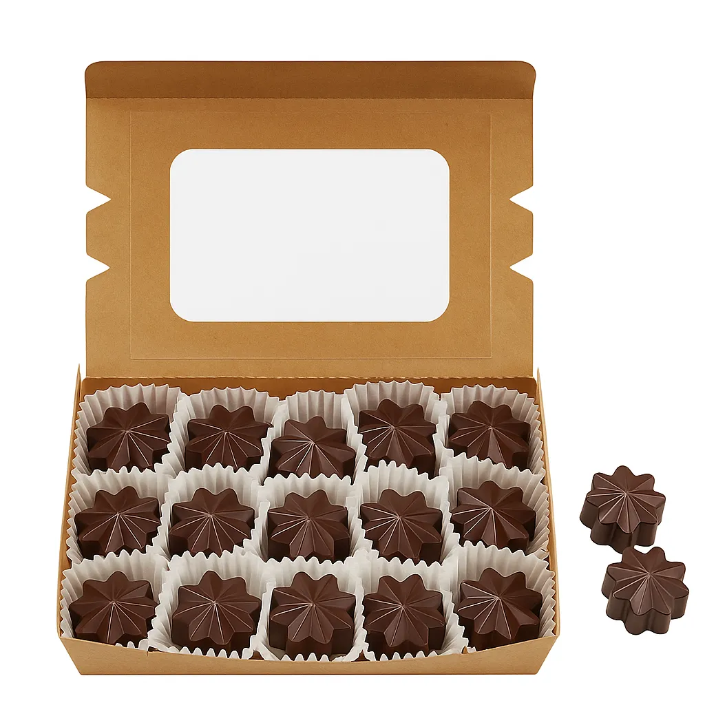 Caja de 11 bombones, rellenos con chocolate semi bitter, harina de almendras y cobertura de chocolate con almendras partidas, con un peso de 7 gr.